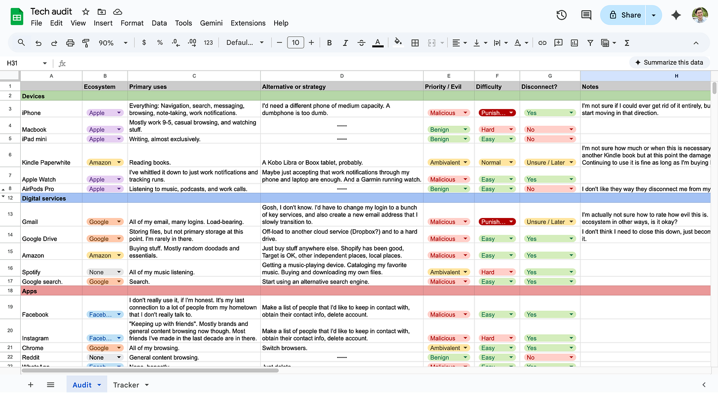 So near the beginning of the year, I created a spreadsheet and audited all of the devices, services, and apps I used. For each one, I filled out the following information: