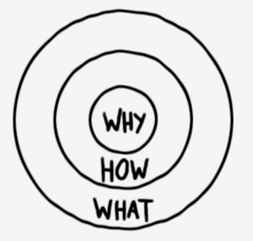 When you ask why, you will naturally generate a laundry list of reasons, justifications, and motives — and there is no substitute for determining your values and what’s worth caring about — but the Golden Circle offers a constructive framework for sifting through these answers. Make a bunch of post-it notes with every possible answer, then ask yourself: what here is a motivation, what’s a method or approach, and what’s a tactic?